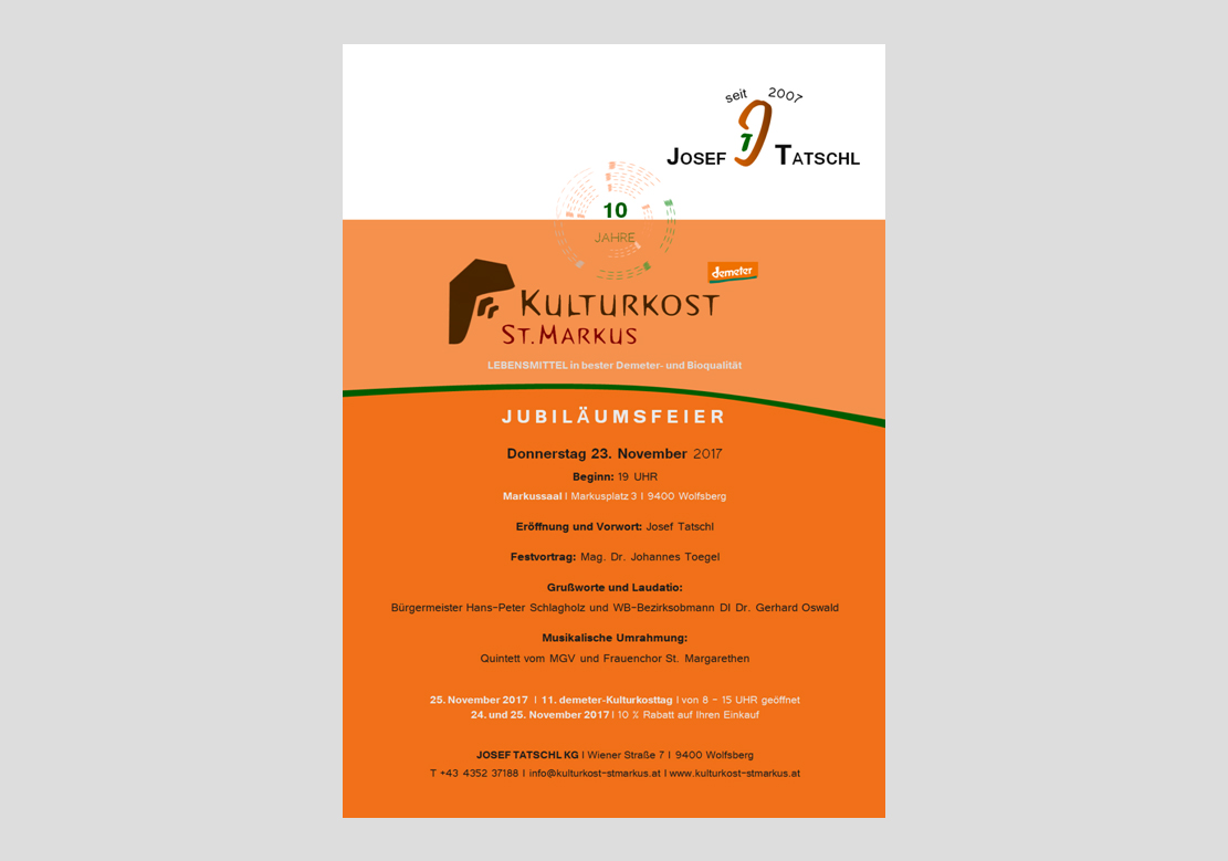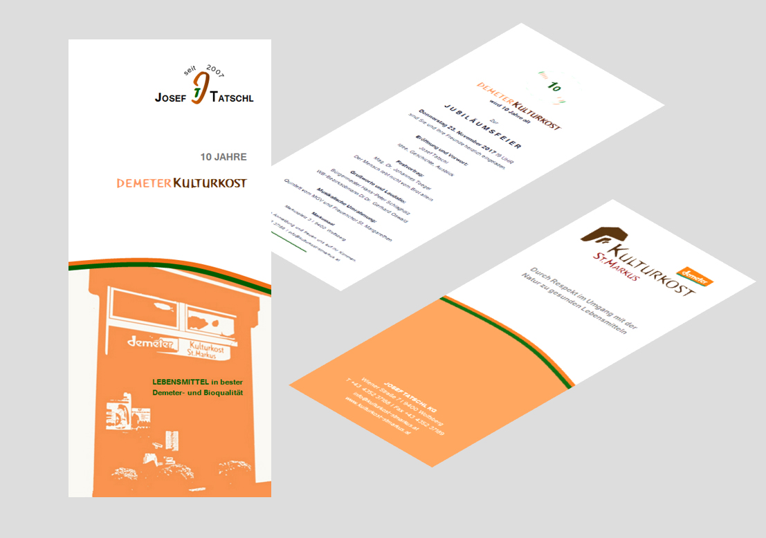Landwirtschaft bei Josef Tatschl heißt Arbeiten mit der Natur. Sein Biohof arbeitet seit fast 30 Jahren nach Demeter-Richtlinien. Der biologisch-dynamische Landbau ist ein Kreislauf aus Boden, Pflanze, Tier und Mensch. Durch selbst hergestellte, feinstofflich wirkende Präparate aus Mist, Heilpflanzen und Mineralien wird die Bodenfruchtbarkeit nachhaltig gefördert und das charakteristische Aroma der Lebensmittel voll entwickelt. Neben der Bewirtschaftung des Hofes betreibt er seit 2007 den Demeter Kulturkostladen St. Markus in Wolfsberg mit eigenen Produkten und Lebensmitteln von regionalen Bio-Bauern. Für Josef Tatschl gestaltete und entwickelte ich Elemente des Corporate Design (u.a. LOGO, Visitenkartenentwurf) sowie diverse Folder und Veranstaltungsflyer.